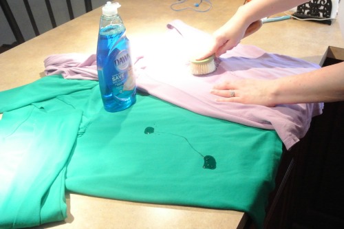It was incredibly easy. All I had to do was pour the Dawn right on to the stains and let it sit for about ten minutes. Then I used the kitchen brush to give each stain a quick scrub. I only took the brush back and forth about five or six times because I didn’t want to damage the fabric.